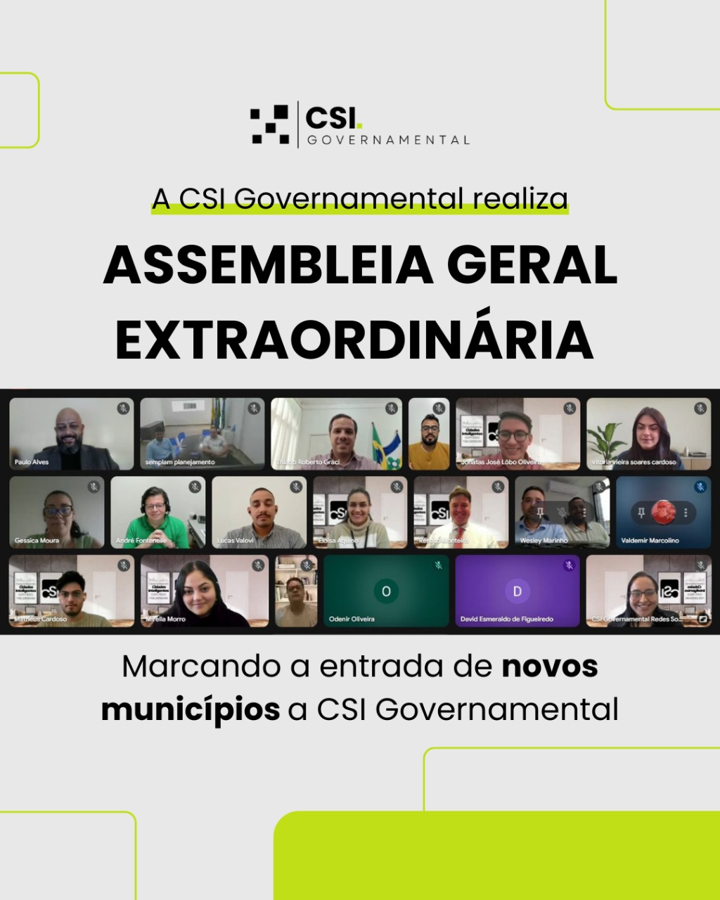 A AGE teve como pauta principal a deliberação sobre ajustes no Estatuto Social da Companhia, bem como análise e a aprovação da entrada de dois novos municípios como acionistas: Vilhena e Corumbiara, ambos do estado de Rondônia. A adesão foi formalizada com base nas respectivas leis municipais, Lei n° 6.534/2025 de Vilhena e Lei n° 1569/2025 de Corumbiara, que autorizam a participação das cidades na estrutura societária da CSI Governamental.