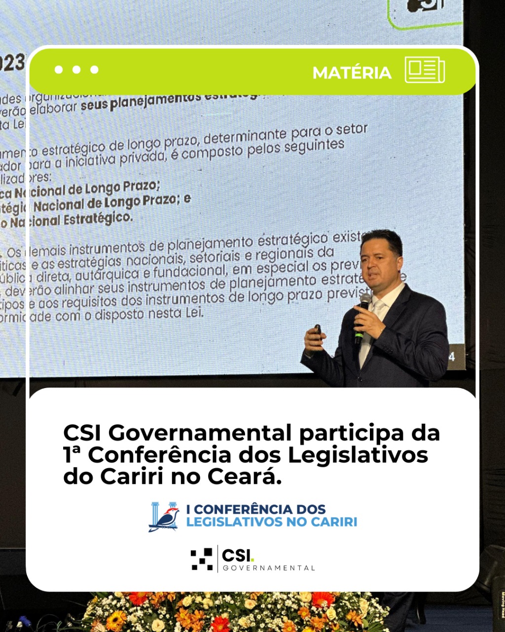 A CSI Governamental reafirma seu compromisso com ações que fomentam a inovação e a transparência no Setor Público e ficamos gratos por apoiar e fazer parte da 1° Conferência de Legislativos no Cariri. Seguimos firmes no desenvolvimento sustentável de municípios em Cidades Inteligentes.