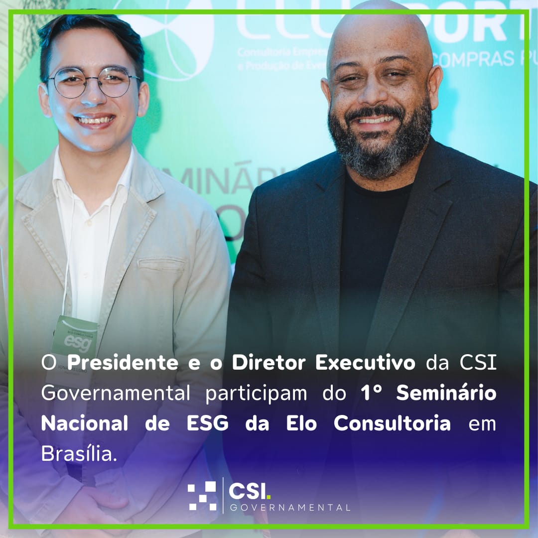 Durante a primeira semana de dezembro, nossos caros Presidente e Diretor Executivo da CSI Governamental marcaram presença no 1° Seminário Nacional de ESG, organizado pela Elo Consultoria em Brasília. O evento foi uma excelente oportunidade para discutir temas relacionados à Governança Ambiental, Social e Corporativa.